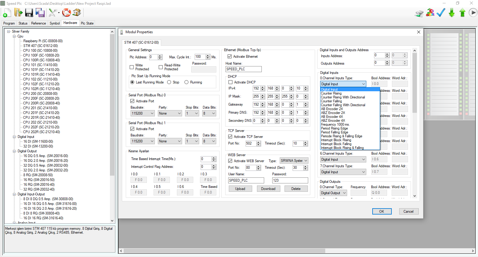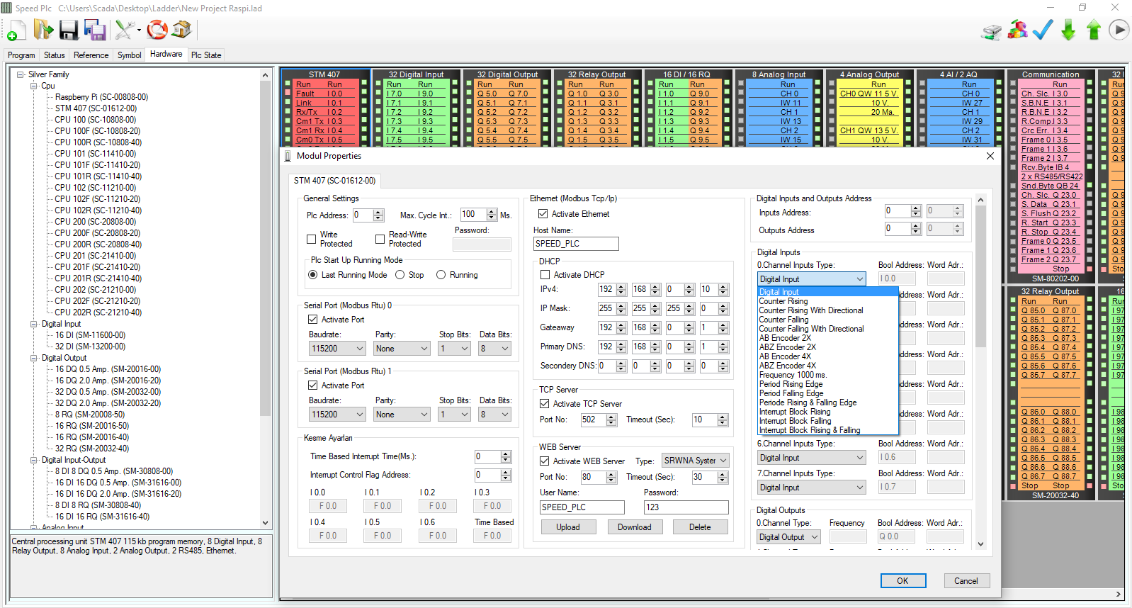 Speed PLC program is free. Speed Plc is a complete system that allows you produce a PLC. It consists of Speed Plc editor software (the program that runs in your computer) and firmware (operating system loaded in the chip or board). With Speed Plc editor program you can prepare plc code in ladder language. The code you have prepared will be operated by the firmware. With the Speed Plc editor program you can control all the features of Plc. Firmware is currently only available for Raspberry Pi and STM32f407VGT6. We will prepare the firmware for other boards and integrate it into the Speed Plc system within a short time.