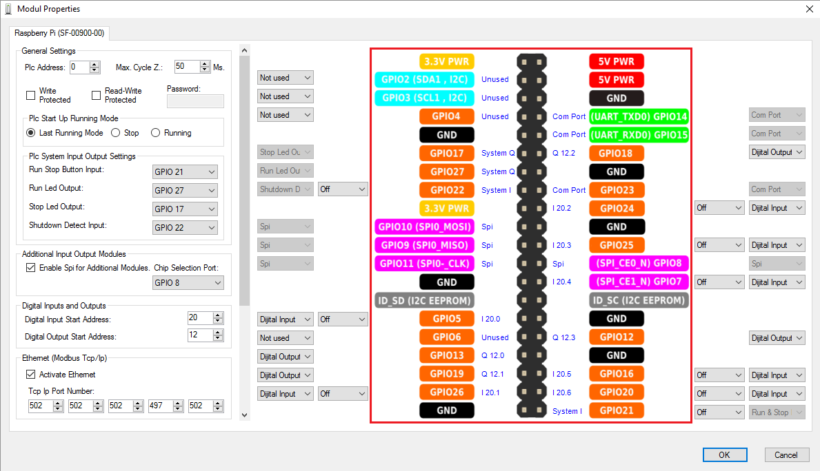 - Plc shutdown detection input. Persistent values should be stored to the disk by the firmware when the plc shutdown. With this signal, shutdown of the plc detected and the values are recorded. Raspberry Pi can be used as plc without any other system inputs. But without this input, data values will never be persistent. However the Plc code is always saved to disk.